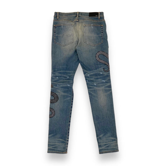AMIRI GLITTER SNAKE DISTRESSED DENIM JEANS BLUE 34W